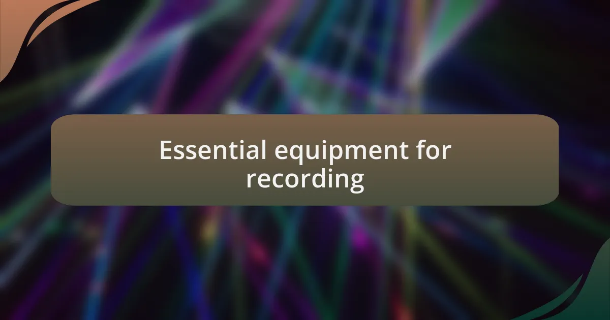 When it comes to essential equipment for recording, the microphone is undoubtedly at the top of the list. I remember the day I invested in my first quality condenser mic; it felt like a game changer. The clarity and warmth it brought to my vocals made every session feel more professional. Have you ever noticed how a good mic can elevate something simple into a moment of magic in your music?
